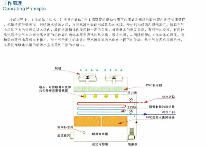 關(guān)鍵詞:閉式冷卻塔,螺旋管式蒸發(fā)器,蒸發(fā)式冷凝器 產(chǎn)品概述:MKB系列閉式冷卻塔的核心部件為紫銅。不銹鋼,碳鋼無縫管材料制成的換熱器,工作介質(zhì)在管內(nèi)流過,熱量傳過管壁,經(jīng)外循環(huán)水與強(qiáng)制對(duì)流的空氣充分進(jìn)行熱交換將熱量排除設(shè)備。該